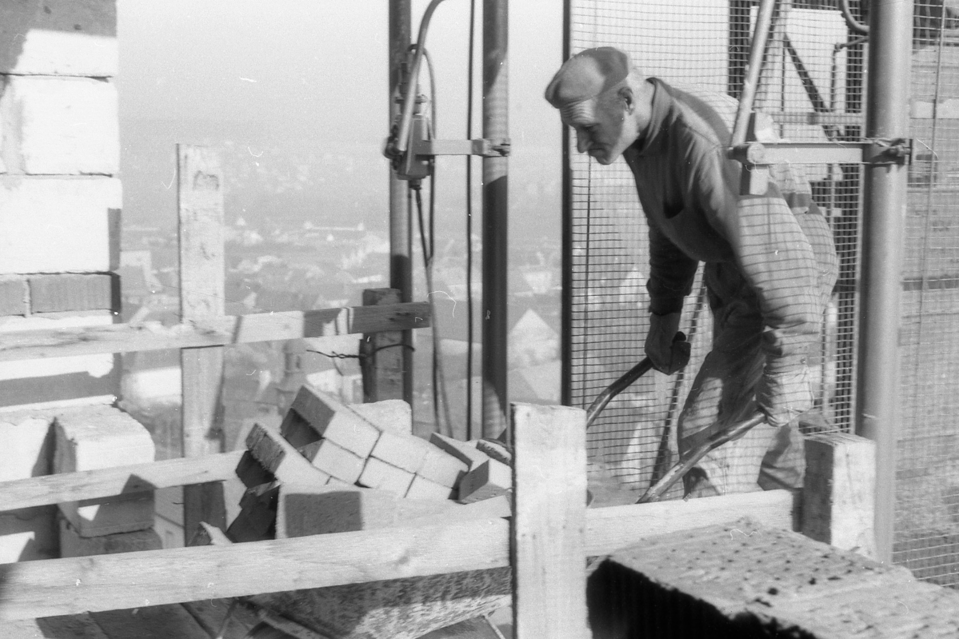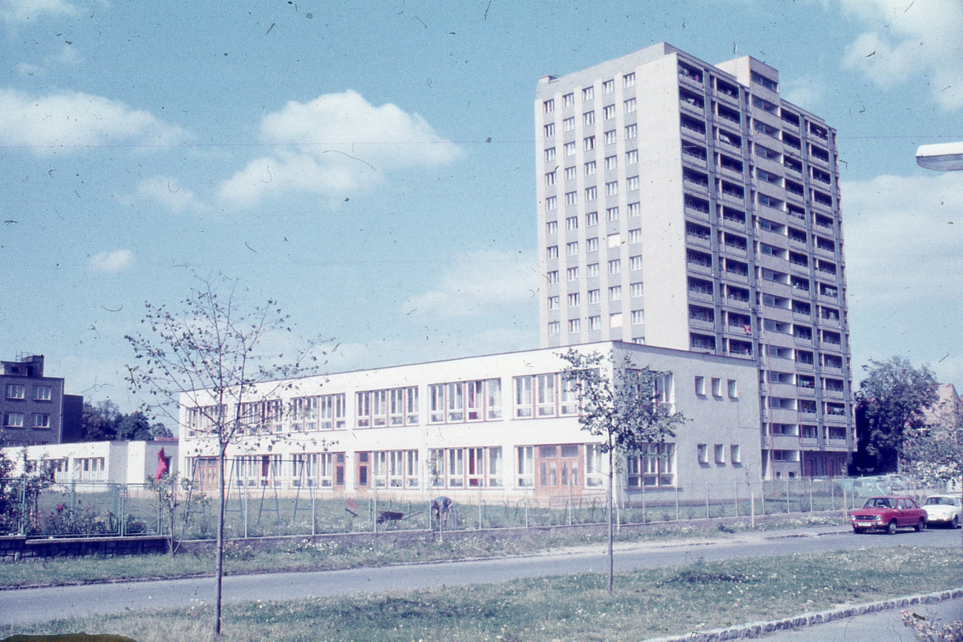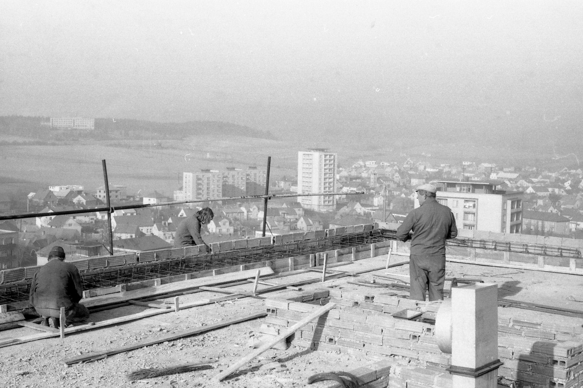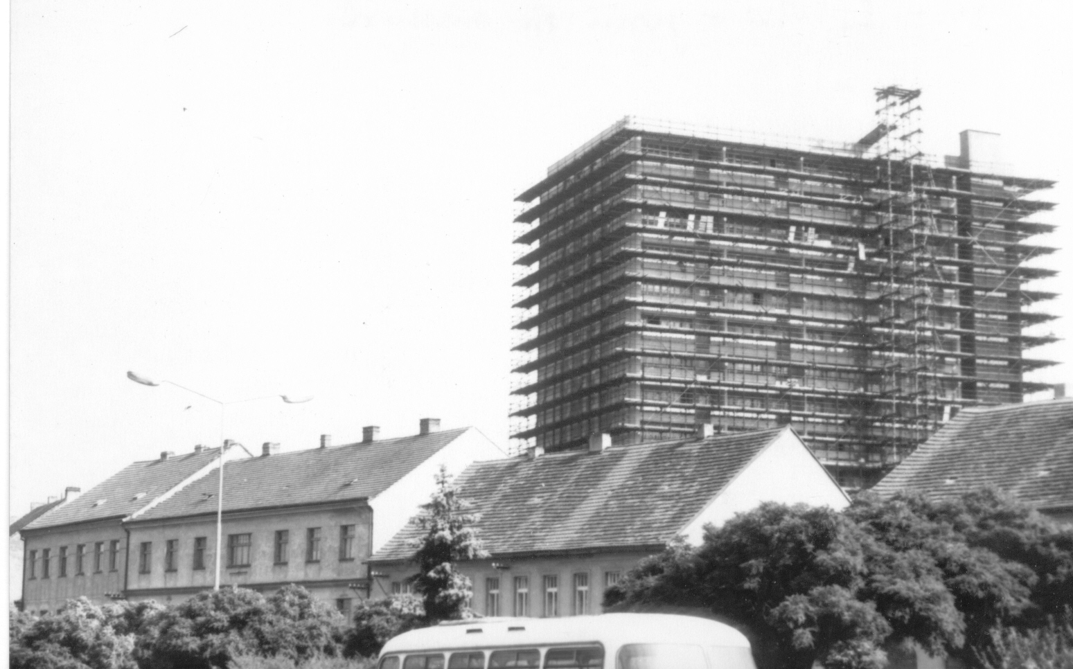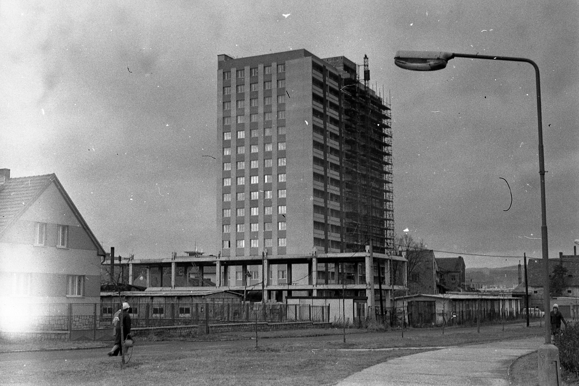 Vlevo a nahoře máme dlouhou sérii snímku ze stavby čtrnáctipatráku které z valné většiny pořídil jeden z dělníků, kterým byl již v té době důchodce pan Alois Rys. Bývalý aktivní člen Sokola, než ho vyloučili a dlouholetý úředník v místní záložně. I když zde pracoval pouze jako výpomoc, tak díky jeho účasti máme prakticky kompletní foto historii stavbu našeho domu. Jak bylo řečeno, jedná se o betónovou stavbu, která byla vyzděna cihlami. Jednalo se o takový Baťa styl, ale funkční. Díky své výšce dům negativně ovlivňuje proudění kolem sebe, takže zde neustále fouká vítr. V druhé polovině osmdesátých let se dokonce uvažovalo o dostavbě jednoho podkrovního patra a doplnění domu o vysoký televizní vysílač. K tomu už před r. 1990 naštěstí nedošlo. Pokud tedy nepočítáme výstavbu antén mobilního operátora, které vizuálně dům i tak navyšují.